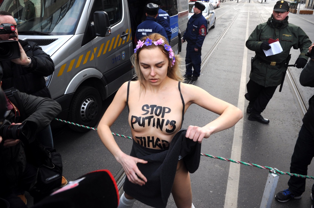 Az ORFK az MTI kérdésére közölte: a Készenléti Rendőrség munkatársai szabálysértés miatt előállítottak egy 26 éves francia állampolgárságú nőt Budapest V. kerületében, a Markó utca és a Balassi utca kereszteződésében. A Femen radikálisnak nevezett feminista mozgalom, amely a legújabb tiltakozóakcióját ezúttal Budapesten szervezte. A még 2008-ban, Ukrajnában alapított - ám ma már Párizsban székelő - csoport nálunk is a védjegyükké vált, meztelenséget alkalmazó demonstrációt választotta eszközéül. A topless akció ezúttal extra mutatvánnyal egészült ki: Budapesten a fiatal francia nő először levette a felsőjét, majd felhúzta a szoknyáját, amely alatt teljesen meztelen volt, a szoknya belső részére pedig az volt írva, hogy "Putin go home!" (azaz "Putyin, menj haza"), egy nyíl pedig a nő festett lába közé mutatott.