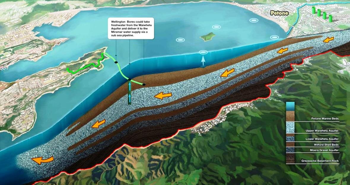 Az új-zélandi Waiwetu víztartó fejlesztési terv. A tengerfenék alatt található artézi vízforrás biztosítja Wellington lakosságának édesvízszükségletének 70%-át. Kép forrása: https://www.wellingtonwater.co.nz/