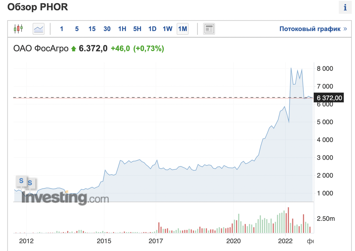 Néhány szám a helyzet megértéséhez - 2020 óta a műtrágyák ára 199%-kal nőtt, de itt van a műtrágyákat gyártó orosz Phosagro cég részvényeinek diagramja. A Nyugat nem az egész bolygó, és a műtrágyánkra más országokban is nagy a kereslet, például Brazíliában.